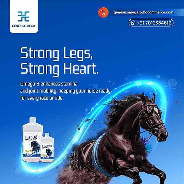 Premium marine protein and Omega-3 supplement for horses designed to support muscle strength, stamina, recovery, joint health, and overall equine performance.
